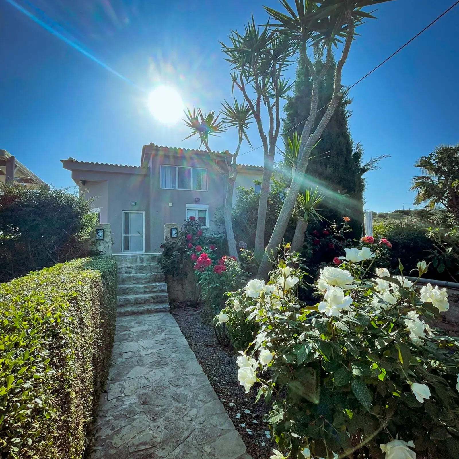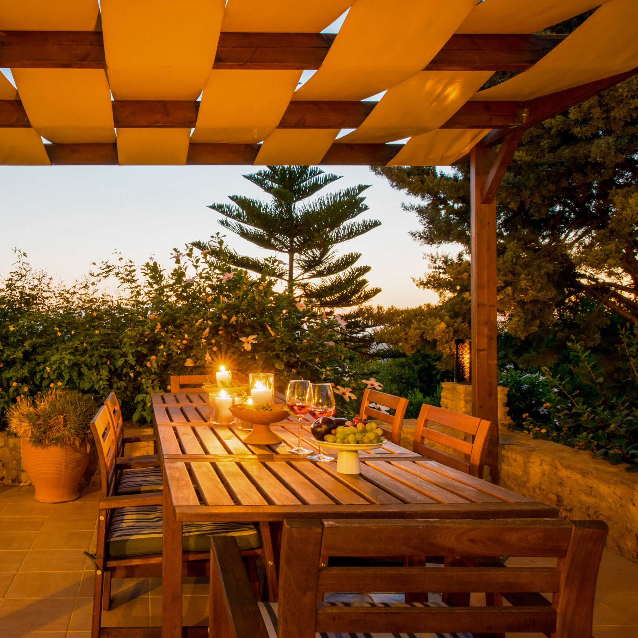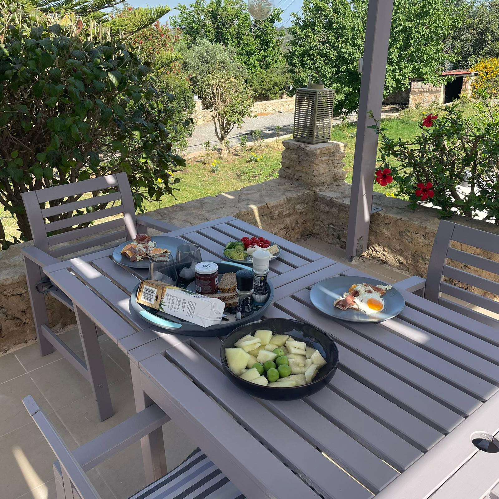 Wakker worden en de zon schijnt, een ontbijtje maken en lekker buiten onder de pergola genietend van het uitzicht.